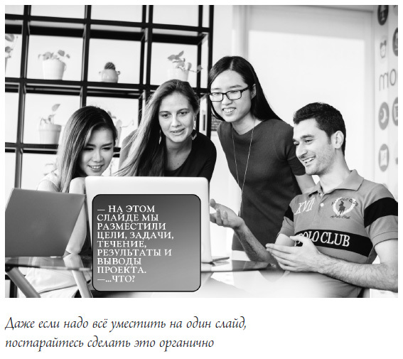 Ещё раз повторим то, что вы встретите буквально в каждой главе этой книги: коммуникации и контекст – основа хорошего менеджмента проектов. Ставьте себя на место слушателей – они должны получить что? У них достаточно времени, чтобы слушать 33 слайда, или нужно ужать всё до трёх?