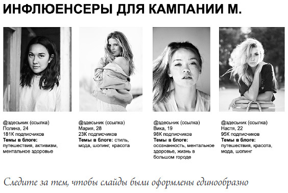 Заранее продумайте композицию и ключевые акценты. Например, вы продали с помощью блогеров 33 000 украшений, что для вашей компании – абсолютный рекорд. Начните с конца – сделайте первый слайд в духе «Как мы продали 33 000 украшений с помощью блогеров» или «Как мы доказали, что блогеры реально продают!»