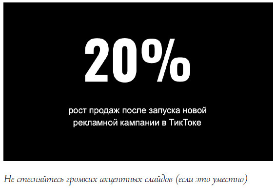 Это добавит вовлечённости в вашу презентацию. Ведь яркий кейс в начале даст зрителю крючок, даст мозгу немного эндорфинов. Не бойтесь звучать провокационно, это лучше, чем «Запуск коллекции украшений с помощью инструмента размещений у инстаграм-блогеров». Это скучно. Мы отвалились уже на втором слове. Играйте со зрителем, вовлекайте, добавляйте интерактив.