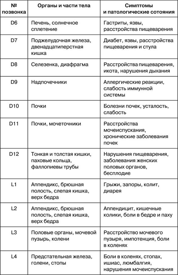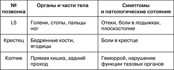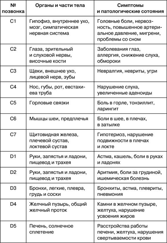На рисунке (рис. 4) указаны отделы позвоночника и позвонки. В таблице 1 указано, какие органы страдают и какие заболевания могут появиться при возникновении проблем в той или иной области позвоночника.