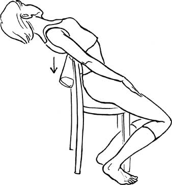 Первый прием технически довольно прост. Нужно облокотиться тем местом позвоночника, в котором ощущается особый дискомфорт, на спинку стула или кресла, положив между спиной и стулом что-нибудь мягкое, например сложенное полотенце. После этого следует прогнуться назад, надавливая весом на остистый отросток позвонка (тот, что расположен кзади). Если при этом возникнет легкий хруст, ощущение небольшого смещения позвонков и чувство облегчения, значит реклинация произведена успешно (рис. 36).