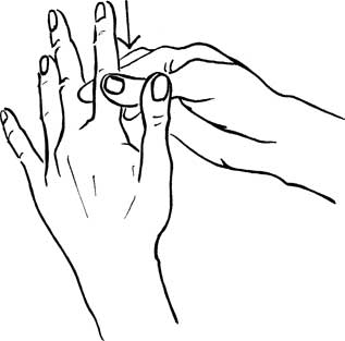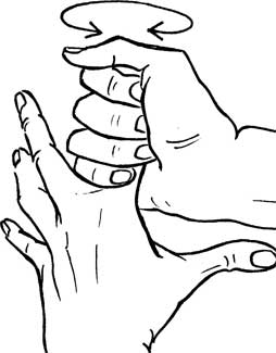 Ладони должны быть подняты, а не висеть, чтобы улучшался отток венозной крови и лимфы. Пальцы нужно растирать, разминать и, двигаясь вверх (при поднятой ладони – вниз), как бы «выдавливать» их содержимое от концевых фаланг – к основным (рис. 79). После этого нужно, взяв каждый палец в кулак, проделать вращательные движения в обоих направлениях, при этом стараясь смещать кожу (рис. 80).