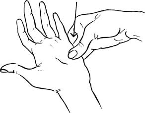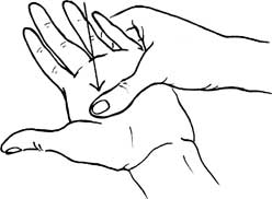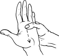 Первым (большим) пальцем нужно, надавив на Thenar (мягкотканый массив на ладонной поверхности над уровнем 1 пястной кости), помассировать его круговыми движениями (рис. 83), после чего то же самое движение проделать в области Hipohenar (такое же образование в области основания 5 пястной кости) (рис. 84).