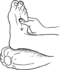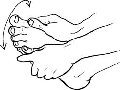 Массаж стоп следует начинать с пальцев. Приемы идентичны описанным при воздействии на пальцы кистей. Затем следует произвести растяжение и сжатие плюсневых костей на стопе – прием «гармошка». Нужно захватить указательными и большими пальцами первые и пятые плюснефаланговые суставы и растягивать их в течение 1–3 секунд в стороны, затем сжимать. После этого нужно, не меняя хвата, произвести «полоскание» плюсневой части стопы путем смещения плюсневых костей расслабленной стопы относительно друг друга (рис. 89).