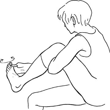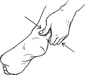 Для работы с этим образованием следует расслабить стопу и проделать пассивную суставную гимнастику. Положив подколенную ямку на одноименный локтевой сгиб, нужно свободной рукой взять пальцы и плюсневые кости и вращать расслабленную стопу по и против часовой стрелки до ощущения тепла в голеностопном суставе (рис. 91).