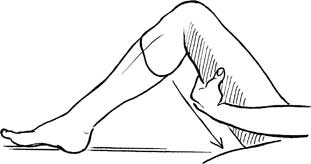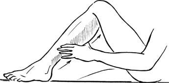 Передняя группа мышц массируется уже описанными ранее приемами при выпрямленной ноге. После поглаживания, растирания, выжимания, похлопываний, рубления и разминания делают вибрацию. Для этого пальцы погружают в мышечный массив и производят вибрирующие движения по ходу мышечных волокон (вдоль конечности) (рис. 94). Протряхивания четырехглавой мышцы бедра можно делать стоя, максимально расслабив переднюю группу и захватив между основанием ладони и четырьмя пальцами (от 2 до 5) мышечный массив. Протряхивая мышцы в этой позиции с некоторым давлением, параллельно производят разминание ее между рукой и бедренной костью.
