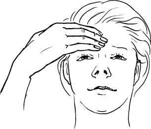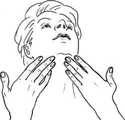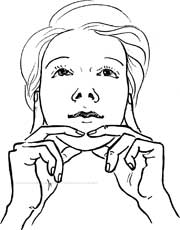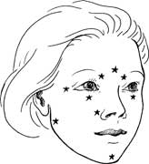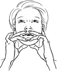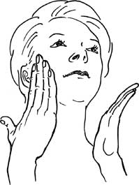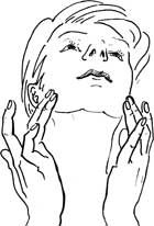 Выполняется собранными вместе 5-ю пальцами в следующих местах: одной рукой – в центре под подбородком, в центре подбородка, одновременно двумя руками с каждой стороны лица – на жевательной мышце, на уголках рта, на скулах напротив козелка, на висках около внешних уголков глаз, одной рукой – на переносице (рис. 130, 131, 132, 133).