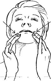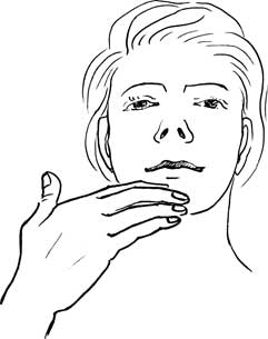 2 позиция – первые пальцы находятся под подбородком, третьи пальцы размещаются над верхней губой, четвертые пальцы – на подбородке под нижней губой. Вторые (указательные) пальцы – вдоль на щеке. Производим такое же воздействие, как и в предыдущем случае (рис. 140).