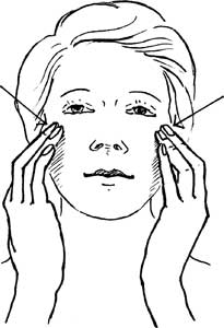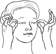 Начинаем с легкого поколачивания подушечками пальцев обеих рук у внешних уголков глаз, дополняемого осторожными щипками (рис. 136).