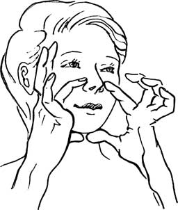 Большие (первые) пальцы обеих рук находится под подбородком. Указательными (вторыми) пальцами разминаем нос (рис. 135). Нажимы проводятся одновременно и симметрично по обеим сторонам носа, строго перпендикулярно коже. Все движения на носу направлены от спинки – к глазницам и верхней челюсти.