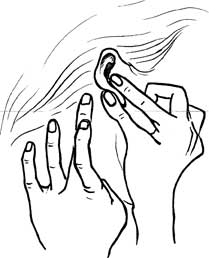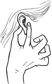 Прием проводится симметрично на обеих ушных раковинах. Вторым (указательным) пальцем надавливаем на козелок, закрывая вход в наружный слуховой проход, большим пальцем удерживаем сзади ушную раковину. Средним пальцем другой руки производится ритмичное легкое постукивание по поверхности сосцевидного отростка – 2–3 раза в 3–5 подходов. Затем делается легкое надавливание на козелок, после чего пальцы резко отнимаются (рис. 141).