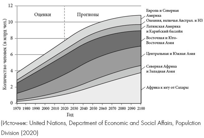 «В период с 2019 по 2050 год население Африки к югу от Сахары удвоится, увеличившись приблизительно на 1,1 миллиарда человек. В Центральной и Южной Азии численность населения, составляющая 2,5 миллиарда человек, к 2050 году возрастёт на 0,5 миллиарда. Население Северной Африки и Западной Азии вырастет на 0,2 миллиарда человек, Восточной и Юго-Восточной Азии – на 100 миллионов человек, как и население Латинской Америки и Карибского бассейна. В последующие три десятилетия практически весь глобальный рост придётся на эти пять регионов. В то же время естественный прирост населения в Европе и Северной Америке составит около двадцати двух миллионов человек».