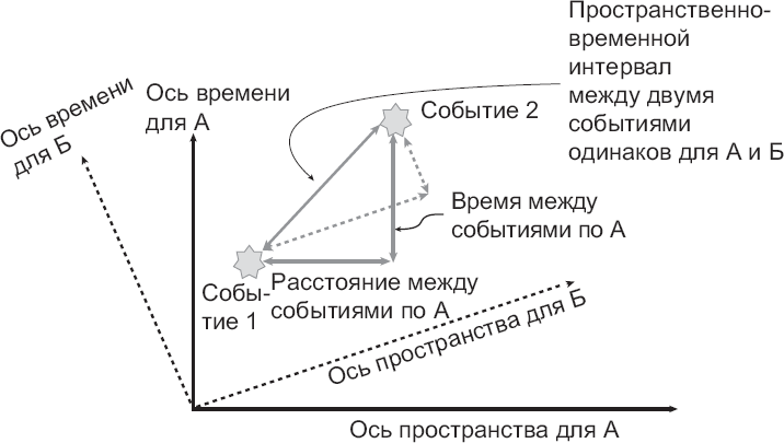 Рис. 1. События в пространстве-времени: два наблюдателя, А и В, движущиеся с большой скоростью относительно друг друга, видят два события (вспышки света), которые разделены в пространстве и времени. Наблюдатели будут по-разному оценивать расстояние и временной интервал между этими событиями. Это объясняется тем, что они по-разному воспринимают пространство и время. Однако в четырехмерном пространстве-времени (для простоты мы здесь пренебрегли двумя пространственными измерениями) пространственно-временной интервал в обеих системах одинаков: два прямоугольных треугольника имеют общую гипотенузу, хотя катеты – расстояние и интервал времени – у них разные.