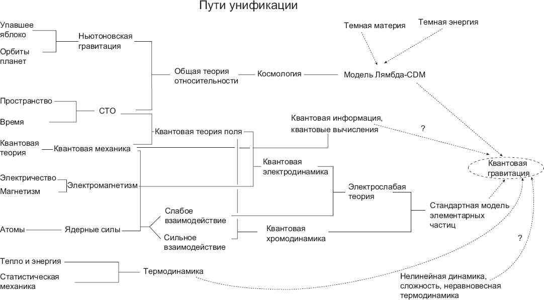 Рис. 4. Унификация – упрощенная схема, иллюстрирующая, как концепты физики (теории, явления, силы) с годами сближались друг с другом. Заметьте, что, хотя хронология соответствует действительности (в направлении слева направо), она не слишком точна. Например, специальная теория относительности расположена прямо под ньютоновской теорией притяжения, хотя последняя появилась на 100 лет раньше