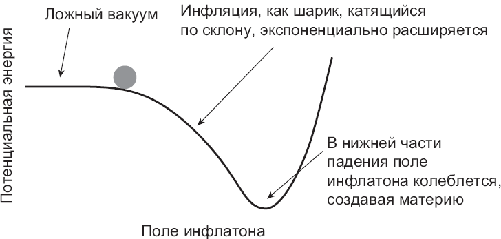 Рис. 5. Инфляция – Вселенная накопила положительную энергию (из которой образовалась материя), «скатываясь» с гравитационного «склона» потенциальной энергии, в то же время расширяя свой объем