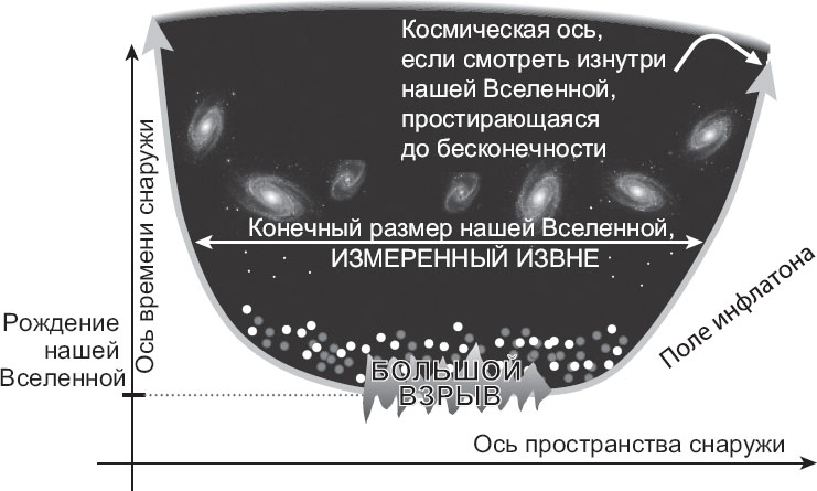 И, прежде чем пойти дальше, я хочу еще сказать вот что. Можно озадачиться вопросом, является ли наша Вселенная бесконечной по протяженности (хотя мы и не можем заглянуть за ее горизонт) – это ведь возможно. Тогда как же бесконечное пространство помещается внутри конечного пузыря, плавающего в Мультивселенной наряду с другими вселенными-пузырями? Ответ будет неожиданным: для нас, находящихся внутри, Вселенная может быть бесконечной по протяженности, но конечной во времени. Однако это только потому, что внутри нашего пузыря искаженное представление о пространстве и времени. «Снаружи» наша Вселенная оказалась бы конечной по размеру, но бесконечной во времени (рис. 6). Это очень точный (хотя, уж простите, концептуально непростой) способ понять, как бесконечное пространство может поместиться в конечном объеме.