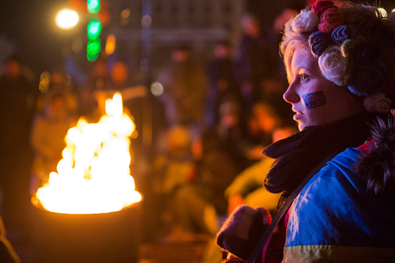 К вечеру на площади собрались десятки тысяч человек, мечтающих о европейском пути для Украины. Огонь был везде: в плюющихся искрами бочках с дровами, в фаерах в руках правых активистов, стоящих неловкой кучкой где-то с краю, в выдохе огнеглотателя, развлекающего оставшихся на ночь.