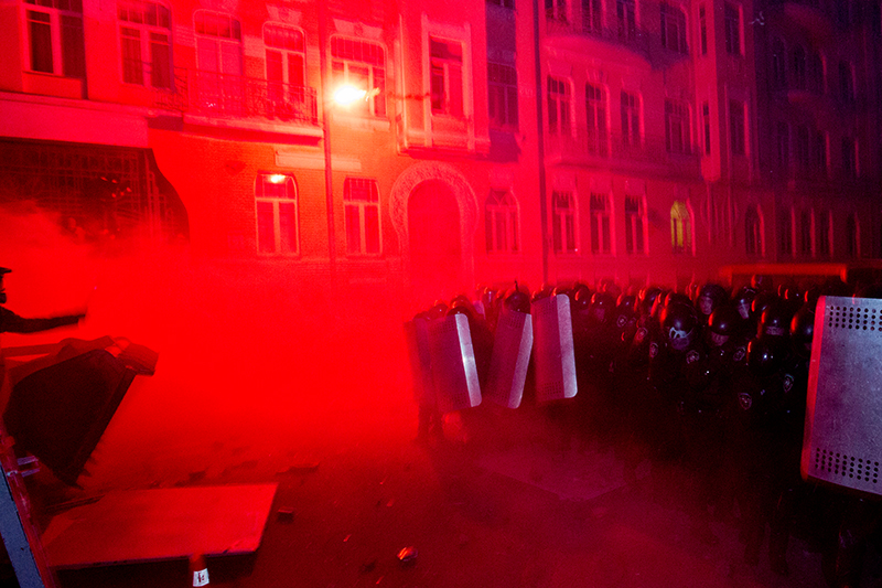 Так было и в ночь на 29 ноября. Вечер до митинга оказался нервным: на другую сторону майдана высадились сотни бойцов местного милицейского спецназа «Беркут» в космонавтских шлемах. Они пытались заблокировать микроавтобусы, везущие к сцене колонки, народ встал вокруг машин в сцепку, кто-то зажег дымовой фаер, но милиции в итоге скомандовали уйти.