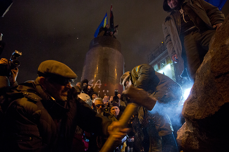 Памятник лежал лицом вниз. Вокруг было не протолкнуться, люди кричали, что Янукович следующий, и то и дело от избытка эмоций начинали петь гимн. Сквозь пение проступали мерные звенящие удары: мужчина средних лет яростно долбил по памятнику кувалдой. Лампы телекамер подсвечивали гранитную пыль, взлетающую после каждого взмаха.