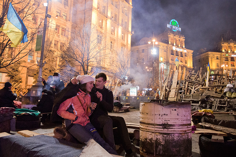 Командировка заканчивалась, и перед возвращением в Москву я решил еще раз пройтись по майдану ночью. У баррикады, смотрящей на мой балкон, пила чай милая парочка. Не веря глазам, я затаился у соседней палатки. Парень накинул на девушку свой жилет и поцеловал ее. Мой кадр сложился — а в двадцати метрах я наткнулся на еще одну парочку, обнимающуюся у баррикады.