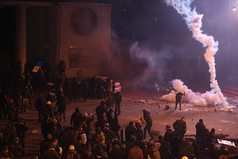 Майдановцы еще несколько часов пытались прорваться к Раде. Они собирались в небольшие отряды: спереди шли самооборонцы со щитами, которые периодически расступались, чтобы вперед могли выбежать метатели камней. В тылу быстро выросла инфраструктура уличной войны. Десятки людей отколупывали брусчатку, пока другие выстраивались живой цепью, чтобы передавать камни атакующим. Рядом готовили коктейли Молотова — их стали зажигать, прикладывая к раскаленным колесным дискам горящих милицейских автобусов. Смесь из бутылок выплескивалась на щиты солдат и заставляла их кататься по земле, сбивая огонь, или убегать к дежурящим позади пожарным. Вскоре автобусы вспыхнули высоченным пламенем.