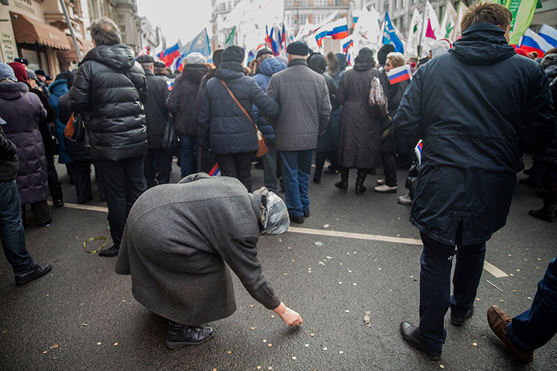 Жесткость риторики потрясала — но еще удивительней была случайная сцена в самом начале акции. Когда марш только стартовал, со столов возле рамок попадали на асфальт монетки, которые люди вынимали из карманов перед досмотром. Колонны с портретами Путина и карикатурами на Обаму шли мимо, а нищая бабушка пыталась выковырять из слякоти мелочь. Ее прогоняла полиция, но женщина возвращалась с виноватой улыбкой.