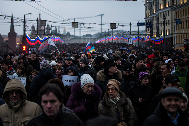 Через несколько недель после траурного марша у Кремля праздновали первую годовщину присоединения Крыма. Гору цветов на месте убийства обнесли забором, а в сотне метров поставили огромную сцену. На митинг снова собрали бюджетников, и они стояли в разных концах площади с одинаковыми рукописными плакатами вроде «Горжусь страной». Власть попыталась показать единство всей политической системы: последним выступал Путин, а фоном для него стали лидеры «оппозиционных» думских партий.