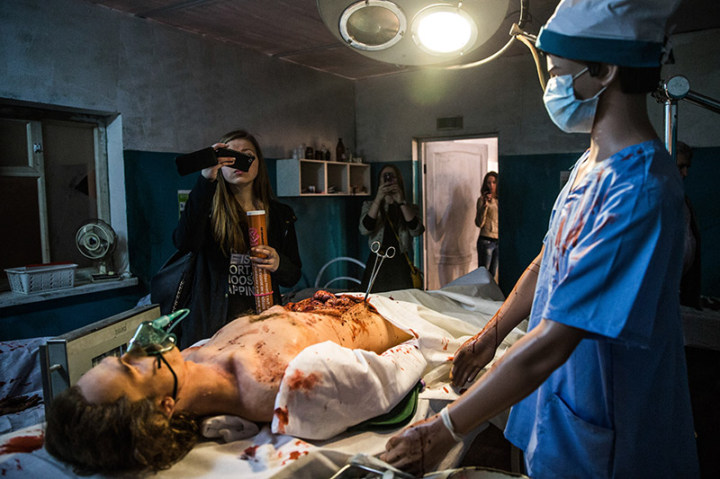Все получилось как надо. Зрители все сильнее хихикали, глядя на абсурдные стороны милитаризации вроде Путина-манекена, нелепых граффити и золотого кальяна-калашникова, а потом резко затихли, увидев последний кадр — операционную с выставки. Собирая серию, я решил, что этот кадр не только приводит в нужную мне точку настроение зрителя, но еще и подытоживает проект, показывая, как легкомысленное отношение к войне оборачивается десакрализацией смерти.
