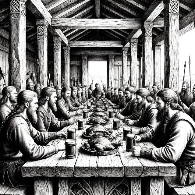 Столы ломились от яств: это грубый, но сытный пир для воинов. Целые туши баранины, запеченные до румяной корочки, гигантские лососи холодного копчения, темный, душистый хлеб, круги сыра, бочонки с ячменным элем и медовухой.