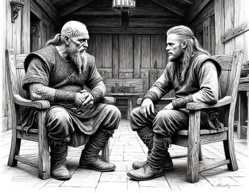 Белые густые брови заснеженными утесами нависали над его веками. В ясных и пронзительно-голубых глазах сквозил острый ум и уставшая насмешка. Его лицо было оцарапано глубокими морщинами. Длинная, тщательно ухоженная седая борода, заплетенная в несколько сложных кос, ниспадала на грудь. Его бритый череп покрывали причудливые, выцветшие синие татуировки — то была память о далекой молодости, о безумных походах в чужие земли, о днях, когда кровь была горяча, а жизнь казалась бесконечной.