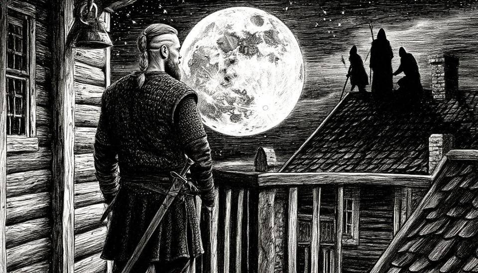 Он что-то невнятно пробормотал в ответ, развернулся и, покачиваясь, сделал шаг обратно к освещенному, шумному порогу пиршественного зала. В этот самый момент мой взгляд, вышколенный неделями постоянных опасностей и выживания в этом жестоком мире, машинально, почти бессознательно скользнул по коньку крыши длинного дома напротив.