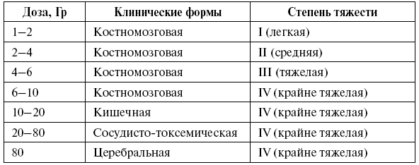 Клинические формы и степени тяжести острой лучевой болезни в зависимости от облучения