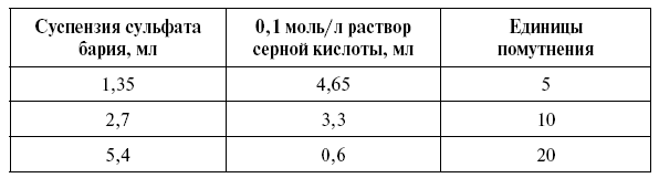 Суспензия сульфата бария: 3 мл раствора хлорида бария наливают в мерную колбу вместимостью 100 мл и доводят объем до метки 0,1 моль/л раствором серной кислоты, при температуре 10 °С (при этой температуре размеры частиц преципитированного сульфата бария дают относительно стабильный результат). Суспензию сульфата бария готовят перед употреблением.