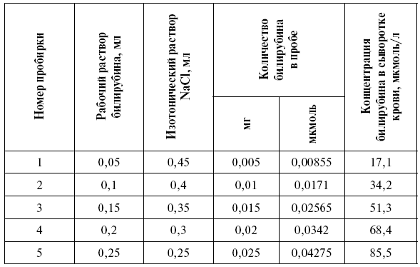 Рабочий раствор билирубина: к 13,9 мл свежей негемолизированной сыворотки здорового человека добавляют 2 мл свежеприготовленного основного раствора билирубина и 0,1 мл 4 моль/л раствора уксусной кислоты. Хорошо перемешивают.
