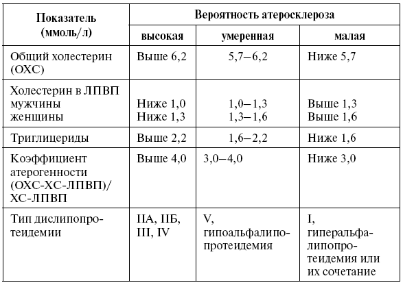 Рекомендуются следующие показатели оценки вероятности развития атеросклероза (табл. 12).