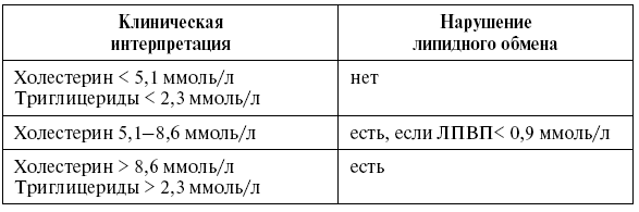Эпидемиологические исследования показали обратную зависимость между уровнями ХС-ЛПВП и распространенностью ИБС. Определение ХС-ЛПВП способствует выявлению риска развития ИБС. Зависимость нарушения липидного обмена от клинической интерпретации представлена в таблице 14.