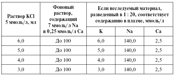 В мерную колбу вместимостью 1 л вносят 33 мл исходного калибровочного раствора КСl, содержащего 100 ммоль/л, и доводят до 1 л; получается фоновый раствор, содержащий 3,3 ммоль/л КСl. В колбу вместимостью 100 мл вносят 1 мл исходного калибровочного раствора NaCl, содержащего 1000 ммоль/л, и доводят до объема 100 мл фоновым раствором, содержащим 3,3 ммоль/л КСl; получается раствор, содержащий 10 ммоль/л NaCl и 3,3 ммоль/л КСl. Из полученных растворов готовят разведение согласно таблице 25.