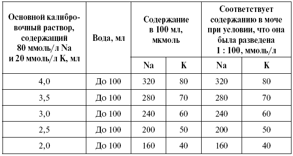 Используют те же исходные калибровочные растворы, что и при анализе плазмы. Для приготовления основного калибровочного раствора в мерную колбу вместимостью 100 мл вносят 8 мл исходного калибровочного раствора хлорида натрия, содержащего 1000 ммоль/л, и 20 мл раствора хлорида калия, содержащего 100 ммоль/л, и доводят водой до метки 100 мл. Получается раствор, содержащий 80 ммоль/ л Na и 20 ммоль/ л К. Из него готовят разведения согласно таблице 23.