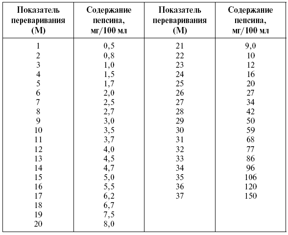 По таблице 30 пересчета показателей переваривания белкового субстрата на содержание пепсина определяют концентрацию пепсина в мг на 100 мл желудочного сока.