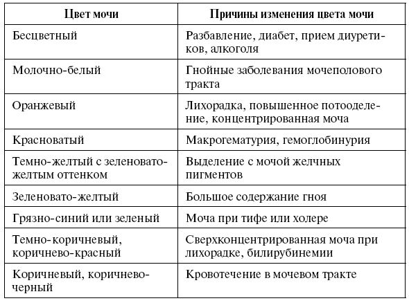 Моча насыщенно-желтого цвета обычно концентрированная, имеет высокий удельный вес и выделяется в небольшом количестве. Бледная моча чаще имеет низкий удельный вес, что наблюдается при полиурии.