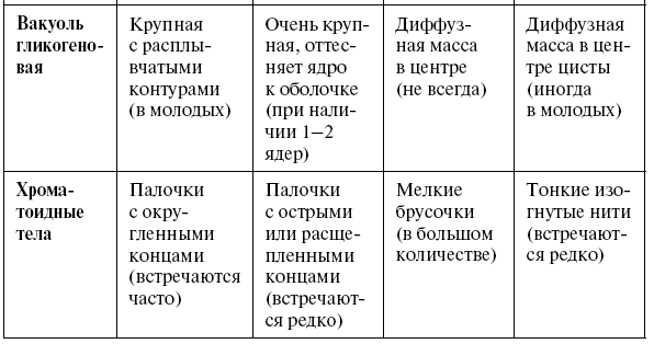 Гликогеновую вакуоль содержат, как правило, цисты, имеющие 1–2, редко – 3 ядра; выявляют ее при окраске раствором Люголя. Хроматоидные тела видны в нативном препарате.