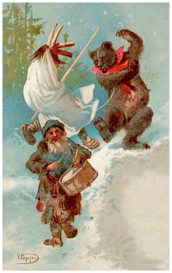Мужчины рядились, чтобы беспрепятственно выпить: ряженым, как мы помним, позволялось вести себя достаточно вольно. Популярной забавой было «вождение медведя». Один в вывернутой наизнанку шубе изображал медведя на цепи; он ползал на четвереньках с веревкой в зубах или на шее и рычал. Другие были дрессировщиком и музыкантами. «Медведь» плясал, а в конце представления показывал, как мужики пьют водку.