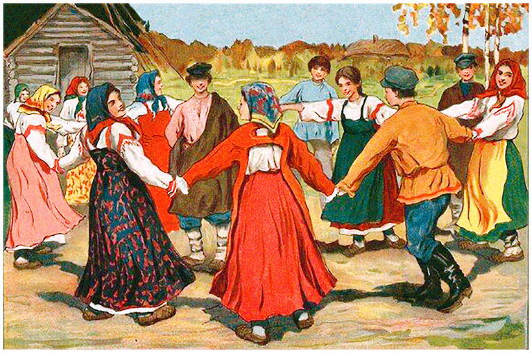 Хоровод. Фрагмент литографии Товарищества И. Д. Сытина. 1900-е. Песни А. В. Кольцова. Москва. Литография Т-ва И. Д. Сытина. 1900-е / Wikimedia Commons