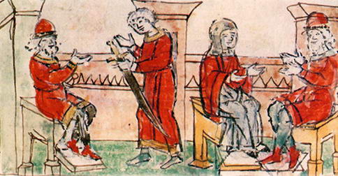 Сваты Владимира Святославича у Рогволода (слева); Рогволод беседует с Рогнедой (справа). Миниатюра из Радзивиловской летописи. Кон. XV в. Библиотека РАН / Wikimedia Commons