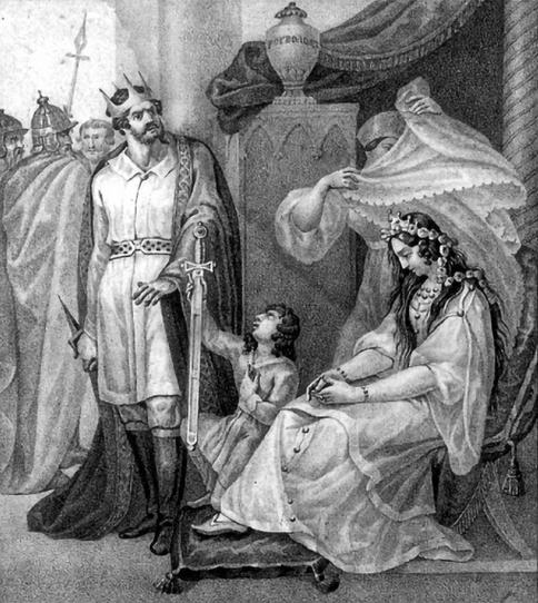Владимир прощает Рогнеду. Литография. 1836. Карамзин Н. М. Живописный Карамзин, или Русская история в картинах. Ч. 1. От Рюрика до нашествия татар. Спб., 1836