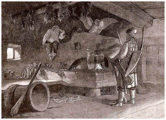 Витязь у Бабы Яги. Гравюра по рисунку Михаила Клодта.