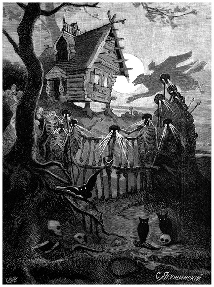 Избушку окружает тын с мертвыми головами, и здесь присутствует не только символика смерти. Это также символ мертвого солнца – знак того, что кто-то инициацию не прошел.