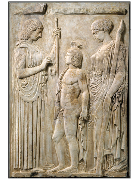 Триптолем получает зерна пшеницы от Деметры и благословение от Персефоны. Римская копия древнегреческого рельефа.