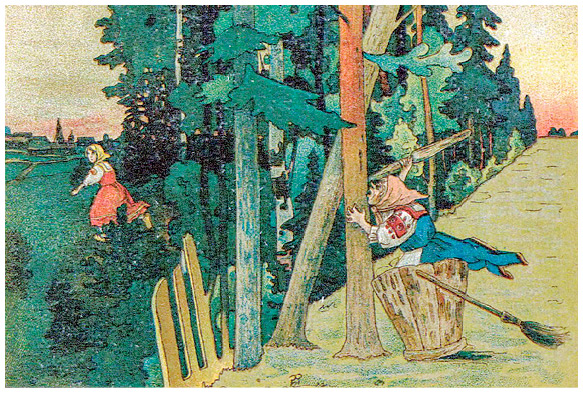 Героиня сказки «Баба Яга» превращает гребешок в лесную преграду. Иллюстрация Анатолия Неручева.