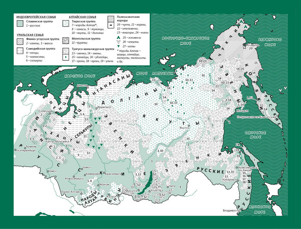 • тюркская группа — якуты, тувинцы, алтайцы, хакасы, шорцы, долганы, тубалары, теленгиты, кумандинцы, телеуты, челканцы, тофалары, чулымцы;